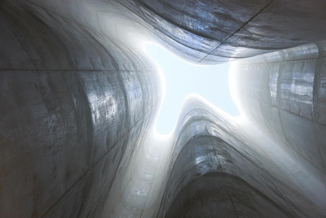 The pilgrims’ column sets a mark that is visible from afar for those approaching the location. It also creates an exciting, almost transcendental space for those that have already reached it. The simple yet striking room inside the column, shaped by the contorted wall, is nothing more than the view to the sky, manifested in architecture. It is an example of architecture without any symbolism and iconographic intentions.