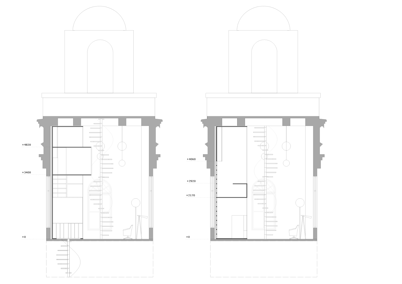 The interior of the tower is designed by i29 interior architects. Room On The Roof wants to offer the artist a unique experience. This was the starting point for i29 to realize an installation that brings together two worlds in one space; playing with scale and perception as in the universe of ‘Alice in Wonderland’. On one side a vertical installation of wooden volumes from floor to ceiling is placed, the other side is a full white space. The wooden installation includes a pantry, storage, desk and daybed. The functions have been stacked on top of each other as a kind of ‘living cabinet’ in order to experience the tower on different levels. Via small ladders you can climb up in the cabinet. Each level gives a new perspective and view to the outside world. All accessories like a telescope, armchair and lamps, are just like the space itself all white to make a contrast with the wooden volume. The monumental spiral stairs leading to the cupola has been restored and adds to the fairytale-like atmosphere.