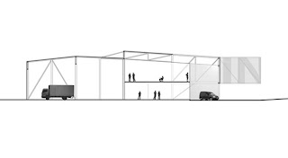 Regional headquarters and showroom for Yuejin Motors situated on the Pan American Highway. The project explores the space found at the intersection of architecture and the image economy of the freeway. The resulting design is a structure, operating as a billboard, that for drivers in both directions momentarily flattens into a single graphic/readable image. Next to its purely graphic accessibility from the freeway the folding logic of the façade parallely creates the space that is inhabited by the staff and clients of Yuejin. The same formal “flip postcard”-logic that makes the project accessible on both a graphic and spatial level is also integrated at other scales throughout the building, including in the way-finding system and for control of visual privacy in certain administrative areas.